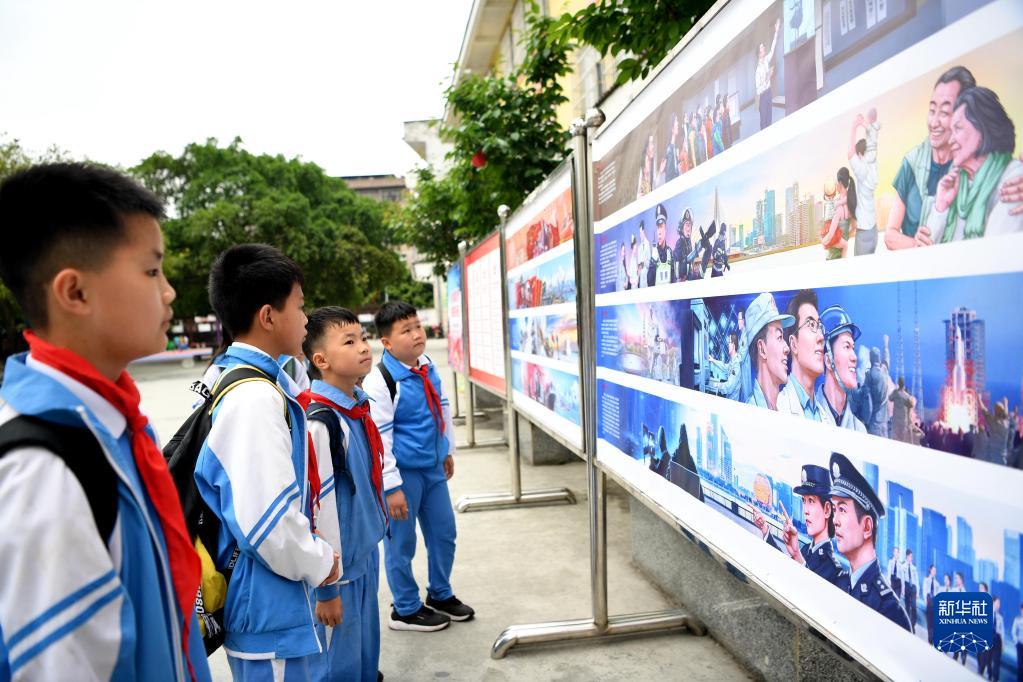 4月14日,贵州省榕江县车民小学学生在观看国家安全教育主题展板。新华社发(王炳真 摄)