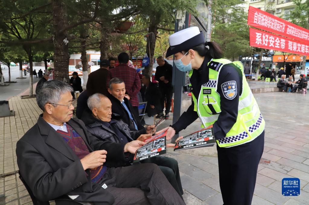 4月14日,贵州省遵义市余庆县公安局交警大队民警在社区发放国家安全教育日宣传资料。新华社发