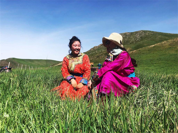 哈斯萨日嘎(左)与游客在草原上聊天。图片由受访者提供