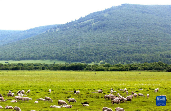 2021年7月15日,羊群在内蒙古锡林郭勒盟东乌珠穆沁旗的草原上悠闲觅食。新华社记者彭源摄