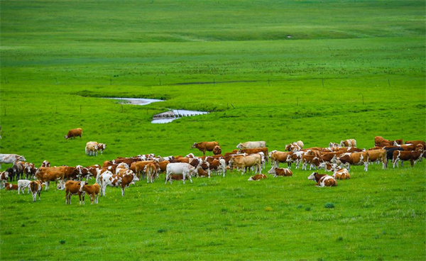 2021年7月15日,牛群在内蒙古锡林郭勒盟东乌珠穆沁旗的草原上悠闲觅食。新华社记者彭源摄