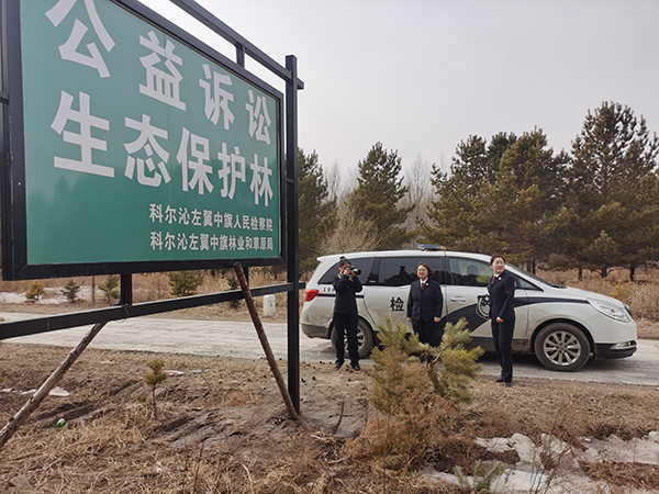 图为2021年3月11日内蒙古自治区科左中旗人民检察院公益诉讼检察人员来到“公益诉讼生态保护林”,即包罕国有林场和乌斯吐自然保护区进行实地勘查,履行公益诉讼检察职责。 李明慧 摄