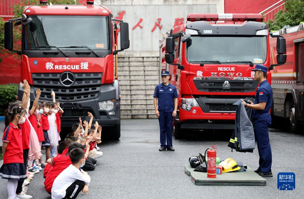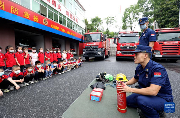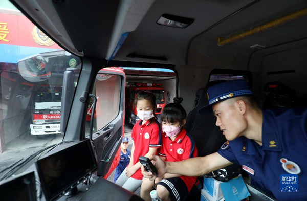 “六一”儿童节临近,湖南省资兴市消防救援大队举办开放日活动,资兴市小红花幼儿园30余名小朋友走进消防站,参观了解消防装备,学习消防知识,增强安全意识。新华社发(李科摄)