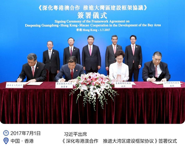 2017年7月1日上午,在习近平主席见证下,《深化粤港澳合作 推进大湾区建设框架协议》正式签署,为打造国际一流湾区和世界级城市群描绘出美好蓝图。