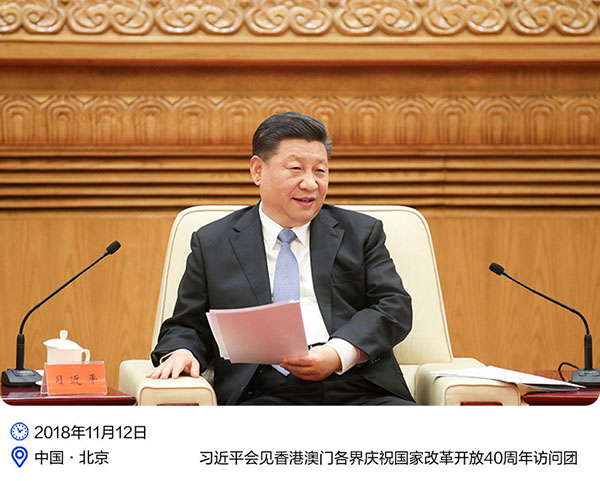2018年11月12日,习近平主席在会见香港澳门各界庆祝国家改革开放40周年访问团时指出:“在国家改革开放进程中,港澳所处的地位是独特的,港澳同胞所作出的贡献是重大的,所发挥的作用是不可替代的。”