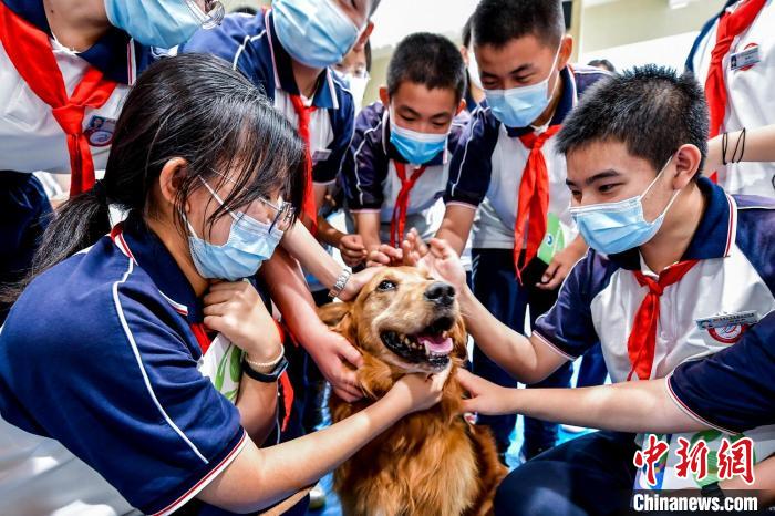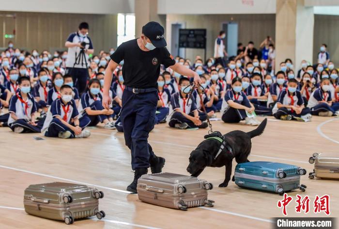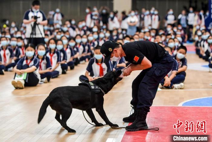 学生们与展示完搜索毒品技能的缉毒犬亲密互动。 刘新 摄