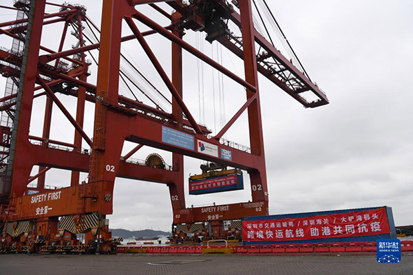 在深圳大铲湾码头,满载供港蔬菜、水果、鸡蛋的集装箱吊装上船(2022年2月21日摄)。新华社记者 梁旭 摄