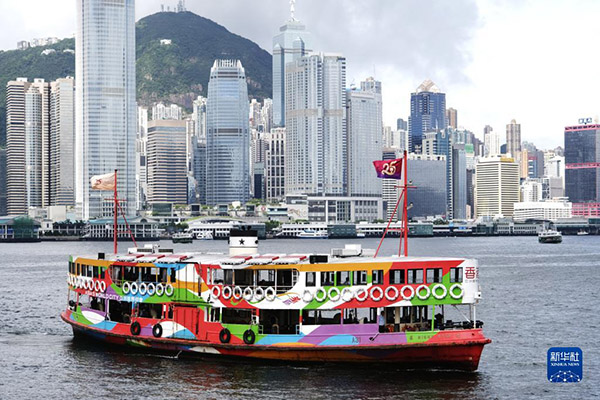 在香港尖沙咀天星码头,天星小轮载着庆祝香港回归祖国25周年标志的旗帜在维港航行(2022年6月22日摄)。新华社记者 王申 摄