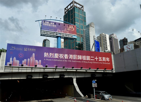 中环码头附近长廊挂上了红灯笼,天星小轮升起了节庆旗帜,新界居民架起了传统大型花牌……香港的大街小巷,到处洋溢着喜庆气氛,在安宁祥和中迎接香港回归祖国25周年。