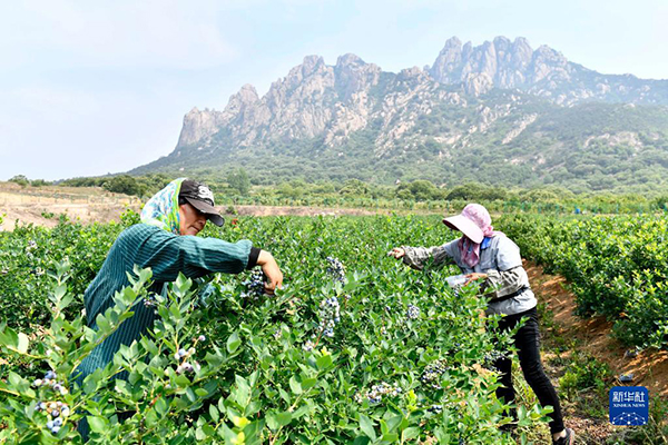 村民在山东省五莲县九五农业现代林果科技产业园采摘蓝莓(2022年6月18日摄)。新华社记者 郭绪雷 摄