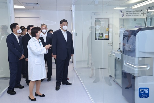 6月30日下午,国家主席习近平在香港特别行政区行政长官林郑月娥陪同下,来到香港科学园考察。这是习近平在香港神经退行性疾病中心考察。新华社记者 刘彬 摄