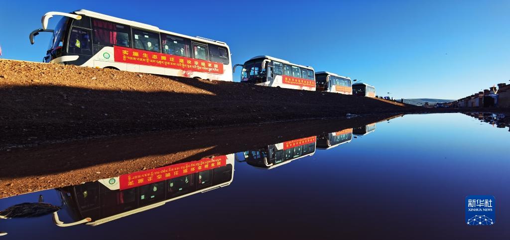 在西藏那曲市双湖县多玛乡拍摄的整装待发的车队,客车载着牧民前往位于山南市贡嘎县的森布日安置点(2022年7月19日摄)。新华社记者 沈虹冰 摄