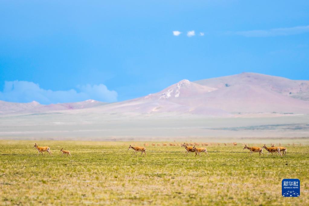 在西藏自治区北部的羌塘国家级自然保护区,藏羚羊在草原上奔跑(2022年7月11日摄)。新华社记者 周荻潇 摄