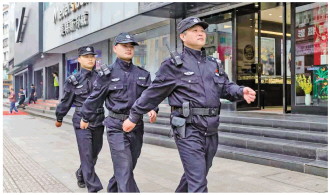 图为王军(右一)带领队员在安徽合肥步行街街面巡逻。 受访者供图