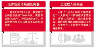4月15日至5月16日开展的党的二十大相关工作网络征求意见活动,得到人民群众广泛关注和参与,累计收到网民建言超过854.2万条,为党的二十大相关工作提供了有益参考——这是全党全社会为国家发展、民族复兴献计献策的一种有效方式,也是全过程人民民主的生动体现。