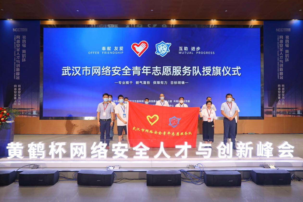 当天,武汉市网络安全青年志愿服务队进行了授旗仪式。该服务队成立于2021年7月23日,成立一年来在册人数已有237人。这支服务队的队员多为在政府机构、金融机构、医疗系统、教育系统等从事网络安全、信息安全的一线管理人员。未来,还将吸引更多网络安全领域人才加入,将这支队伍打造成为网安铁军。