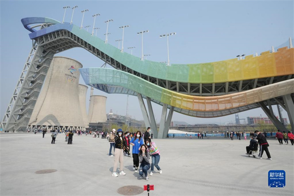 游客在北京首钢滑雪大跳台区域参观游览(2022年4月4日摄)。新华社记者 鞠焕宗 摄