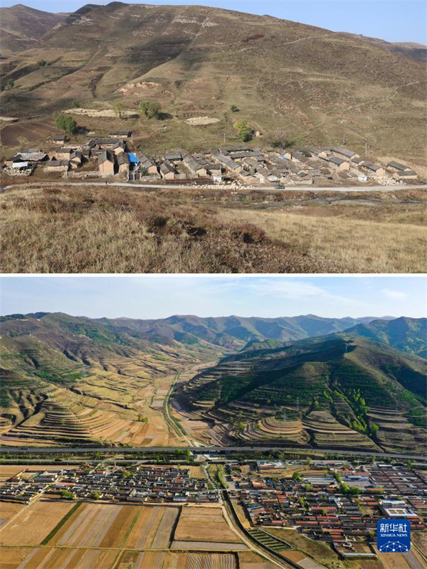 拼版照片:上图为山西省忻州市岢岚县宋家沟村村民在整村搬迁前居住的房屋(资料照片);下图为2020年5月9日拍摄的山西省忻州市岢岚县宋家沟村(无人机照片,新华社记者曹阳摄)。新华社发