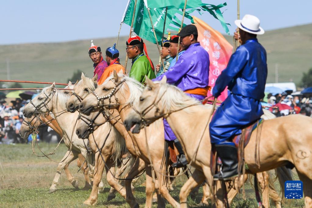 2022年7月29日在内蒙古自治区旅游那达慕开幕式上拍摄的马队。新华社记者 王泽聪 摄