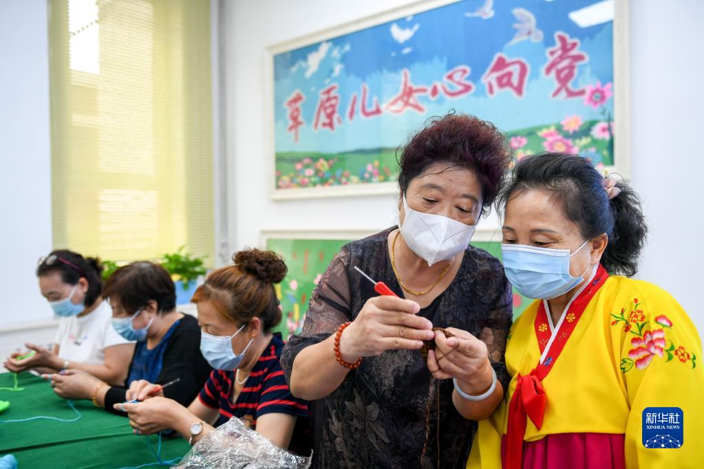 2021年8月31日,内蒙古自治区赤峰市松山区临潢家园社区的一名居民(右二)为民族技艺传承班学员讲解编织技巧。新华社记者 贝赫 摄