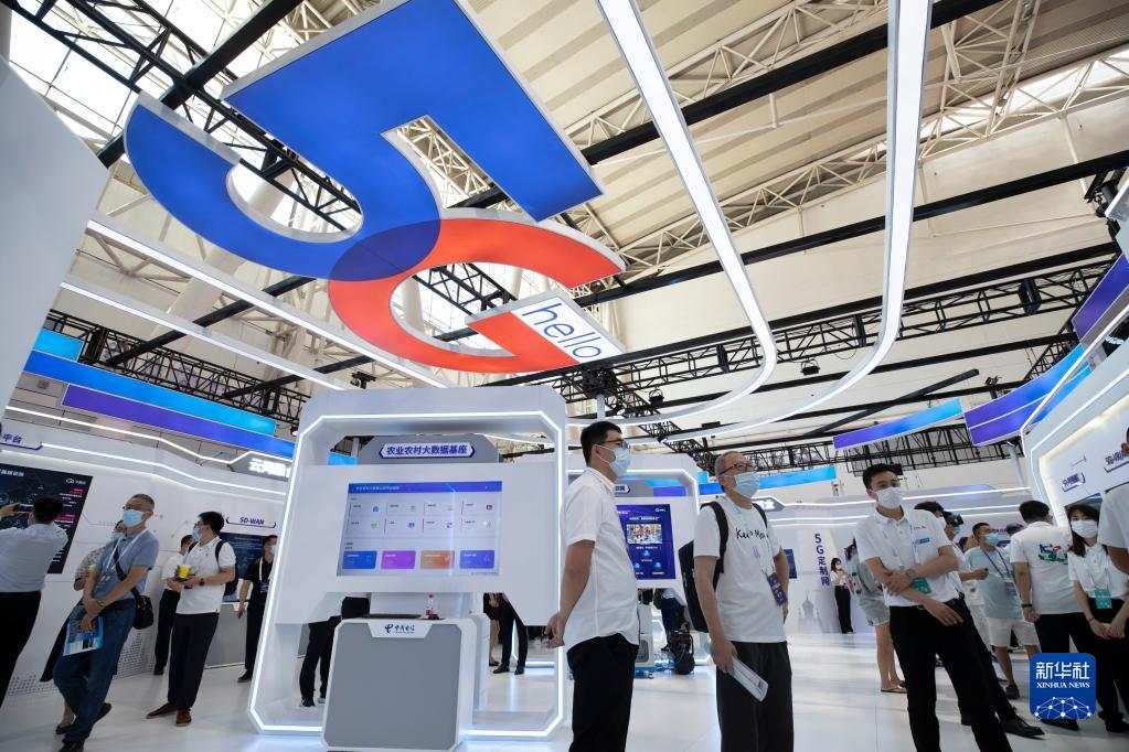 在2022世界5G大会中国电信集团有限公司展区,参观者现场了解5G产品(2022年8月10日摄)。新华社记者 张涛 摄