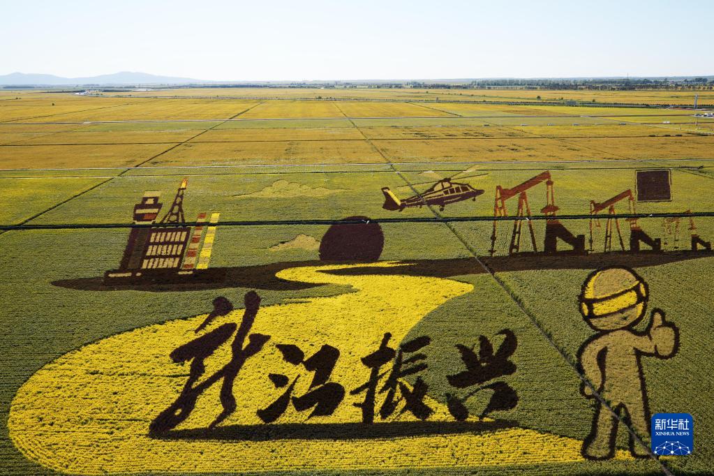 在北大荒集团建三江分公司七星农场有限公司的一块稻田里,一幅“喜迎二十大 引领新征程”的稻田画,吸引不少游客驻足观看。登上观景台,遍野金黄,一派丰收景象。