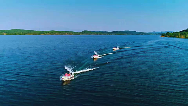 白云之下,登山而望,潮河、白河一路蜿蜒奔涌,汇入密云水库,宽阔的水面宛如明镜,数艘执法船划破水面,画出道道涟漪。