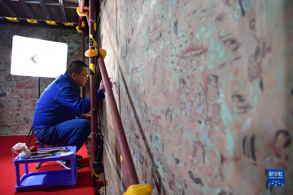 敦煌研究院文物保护技术服务中心壁画修复师杨金礼在莫高窟第231窟内修复出现病害的壁画(2022年4月19日摄)。新华社记者 陈斌 摄