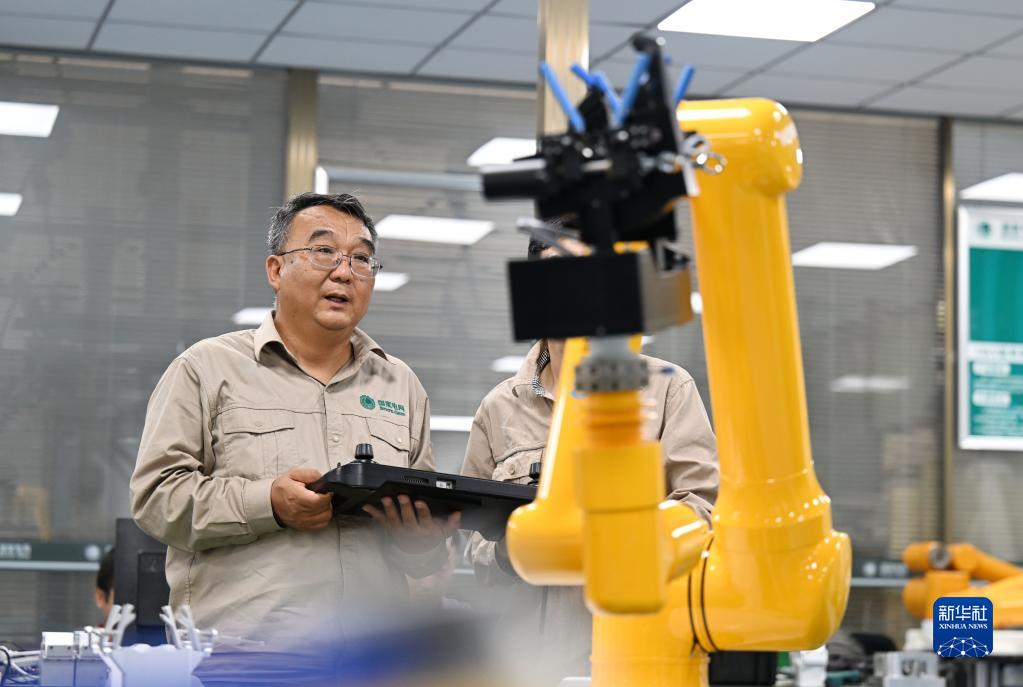 张黎明和同事在调试第四代配网带电作业机器人(2022年9月8日摄)。新华社记者 赵子硕 摄