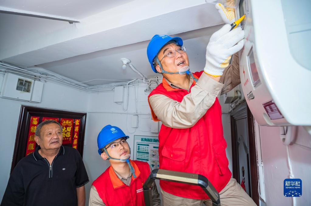 张黎明(右)带领国网天津滨海黎明共产党员服务队到天津市滨海新区丹东里小区为居民查看电表(2022年7月15日摄)。新华社发(李津摄)