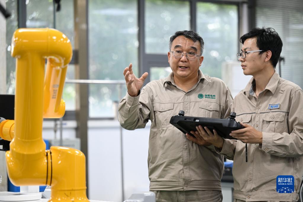 张黎明(左)和同事在调试第四代配网带电作业机器人(2022年9月8日摄)。新华社记者 赵子硕 摄