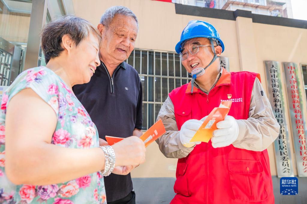 张黎明(右)在天津市滨海新区丹东里小区向居民宣讲安全用电常识(2022年7月15日摄)。新华社发(李津摄)