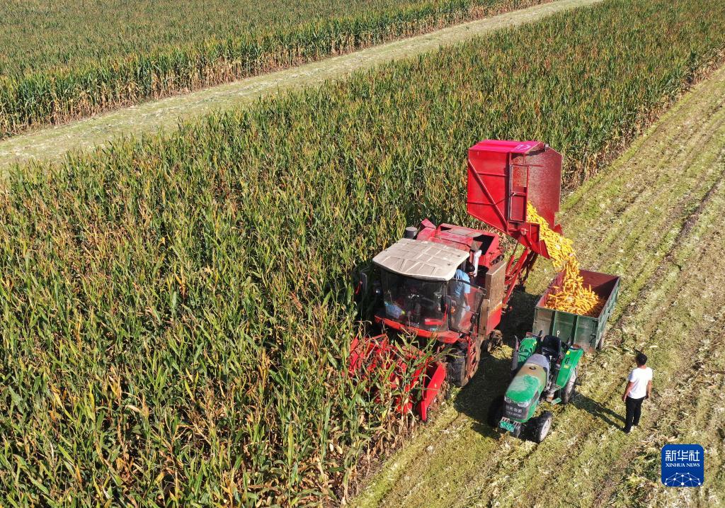 农机手驾驶收割机在河南省尉氏县张市镇沈家村为村民收获玉米(9月18日摄,无人机照片)。新华社记者 李嘉南 摄