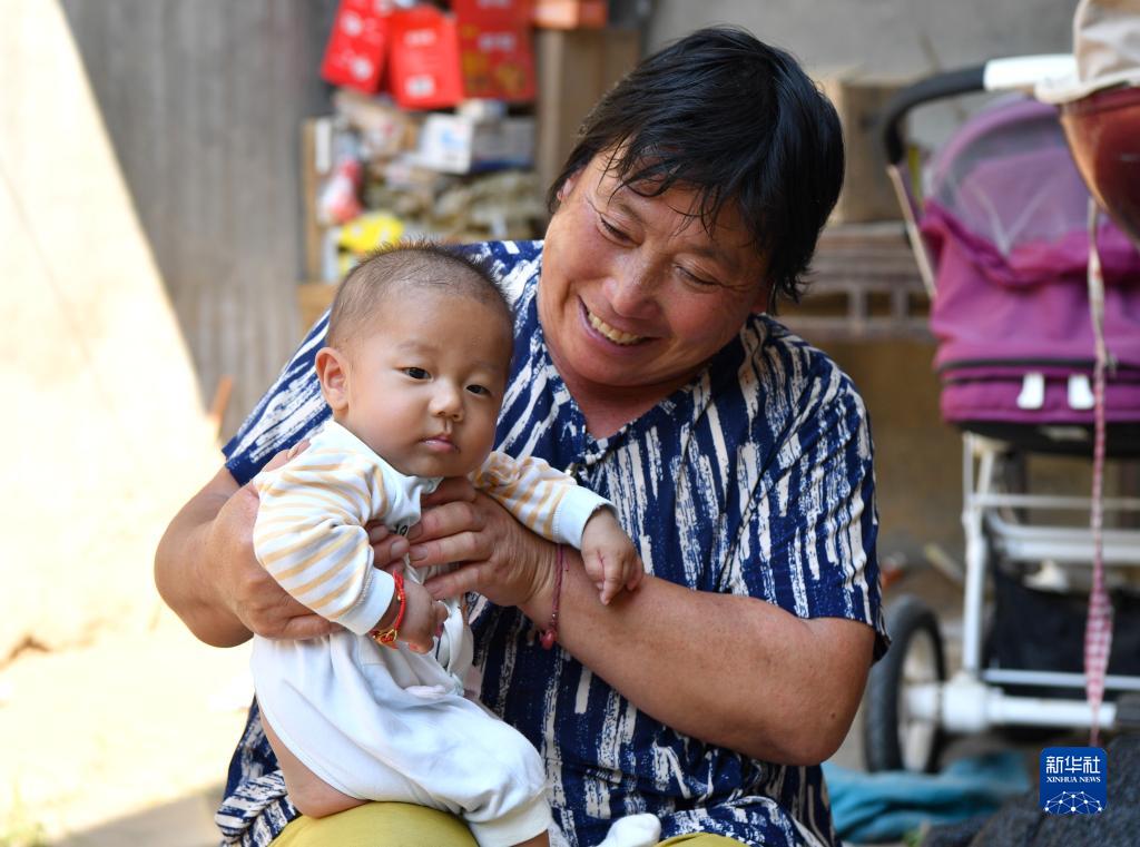 河南省尉氏县张市镇沈家村村民孙六在干完农活后抱起孙子(9月17日摄)。新华社记者 李嘉南 摄