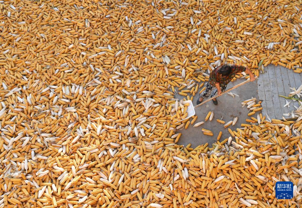 河南省尉氏县张市镇沈家村村民将收获的玉米摊开(9月17日摄)。新华社记者 李嘉南 摄