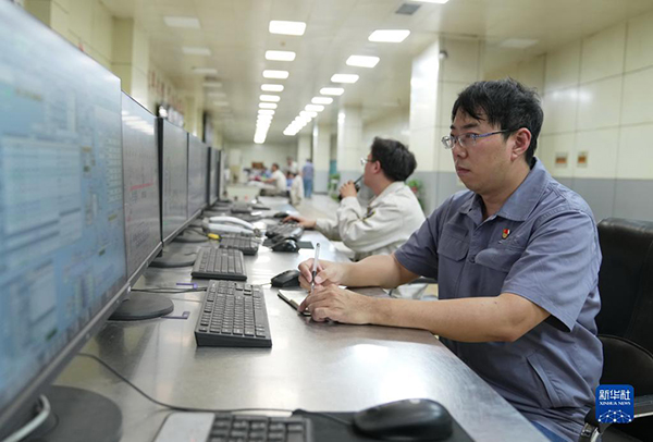 邯宝炼钢厂特档技术主管、转炉车间副主任唐笑宇(右)在转炉车间控制室工作(2022年9月7日摄)。新华社记者 杨世尧 摄