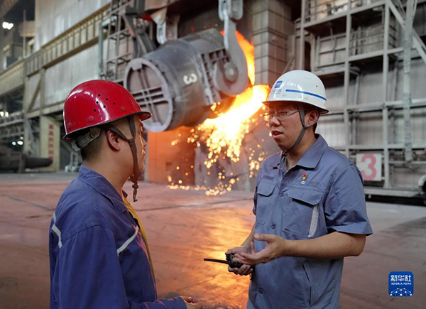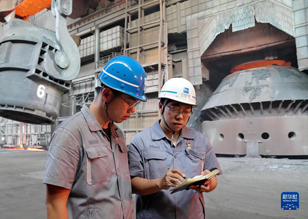 邯宝炼钢厂特档技术主管、转炉车间副主任唐笑宇(右)在转炉车间与工友交流(2022年9月7日摄)。新华社记者 杨世尧 摄