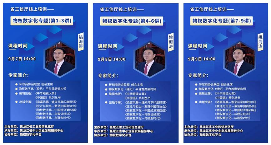 2022年9月7日至9日,由黑龙江省工信厅主办,黑龙江省中小企业发展服务中心承办,物权数字化平台协办的“物权数字化专题”培训活动在线上举办。