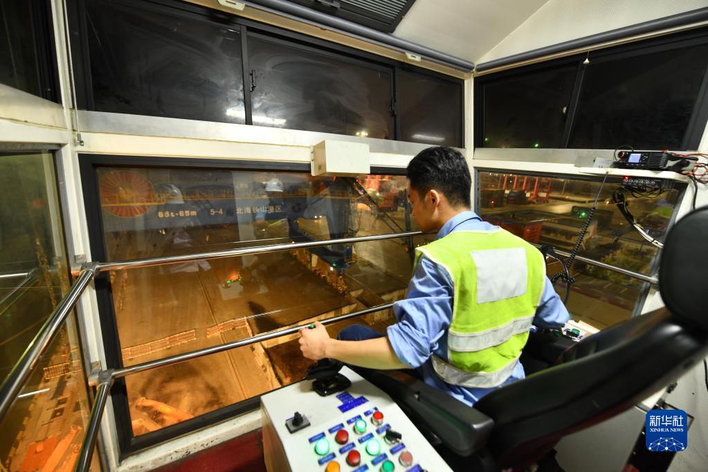 在广西北海铁山港,门机司机黄冠在进行夜间作业(9月21日摄)。新华社记者 黄孝邦 摄