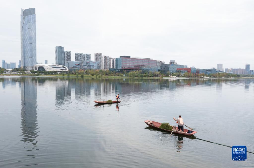 在四川天府新区兴隆湖, 赖小利(左)在捞水草(2022年9月21日摄,无人机照片)。新华社记者 江宏景 摄