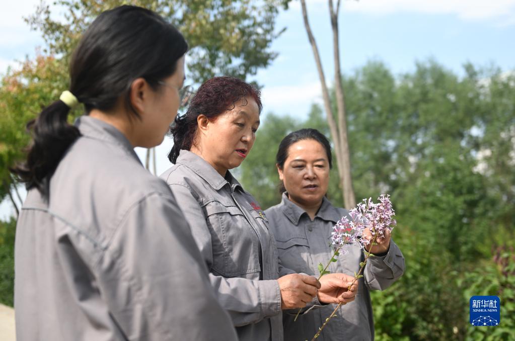 在青海省西宁市林业科学研究所的培育基地内,张锦梅(中)与同事在比较两株丁香花束的异同(9月14日摄)。新华社记者 张龙 摄