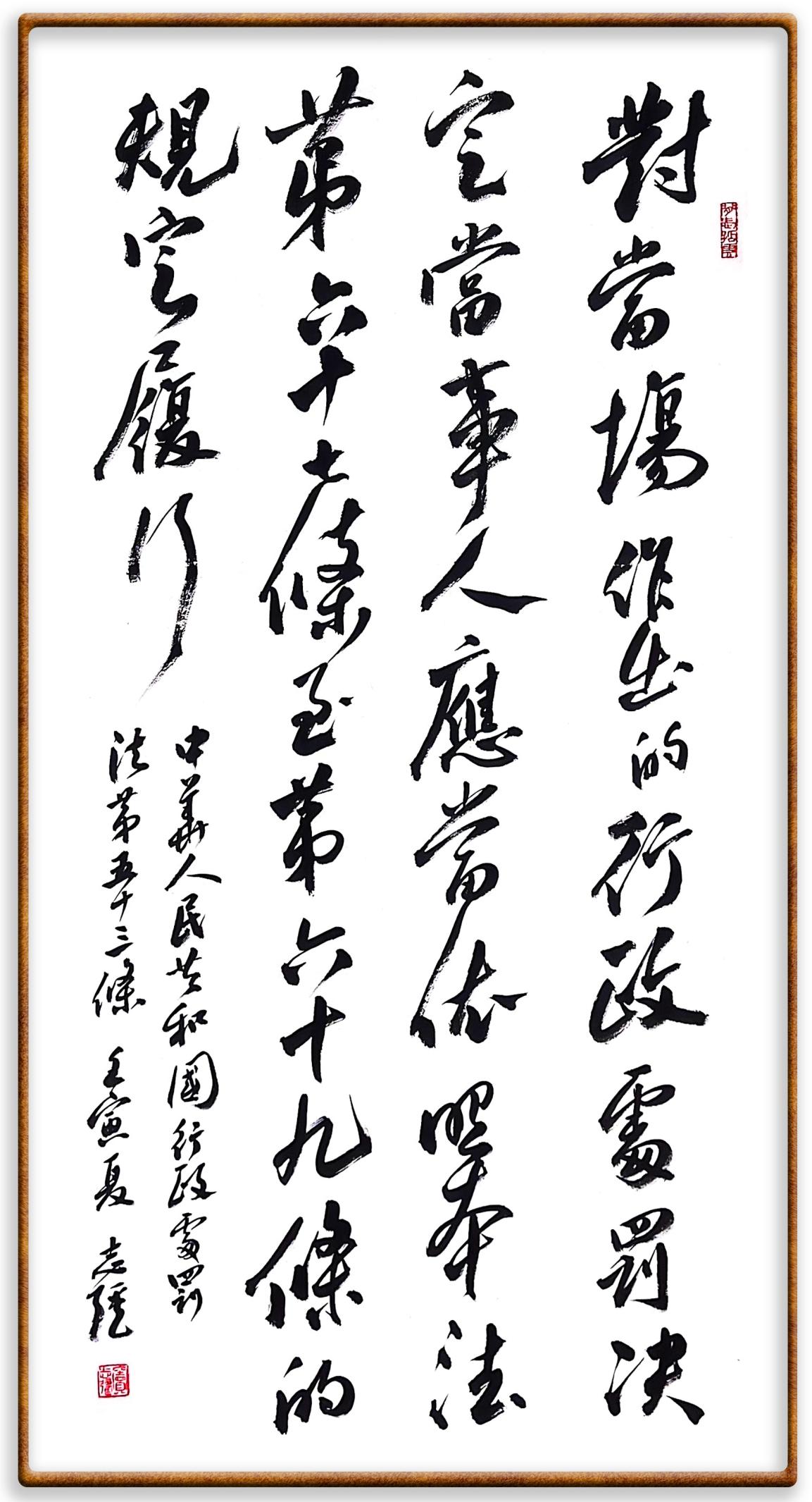 继《中华人民共和国民法典》《中华人民共和国土地管理法》《中华人民共和国土地管理法实施条例》《中华人民共和国法律援助法》之后,法治日报社联合北京市司法局、北京书法家协会,将笔端对准《中华人民共和国宪法》和《中华人民共和国行政处罚法》。