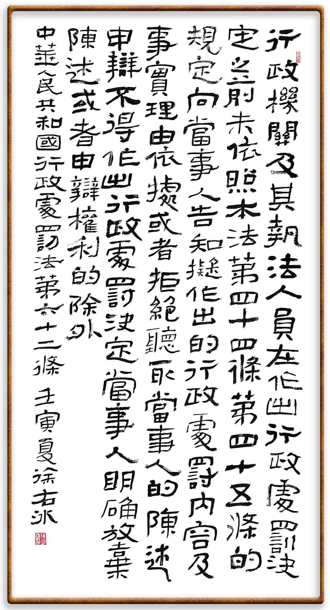 继《中华人民共和国民法典》《中华人民共和国土地管理法》《中华人民共和国土地管理法实施条例》《中华人民共和国法律援助法》之后,法治日报社联合北京市司法局、北京书法家协会,将笔端对准《中华人民共和国宪法》和《中华人民共和国行政处罚法》。