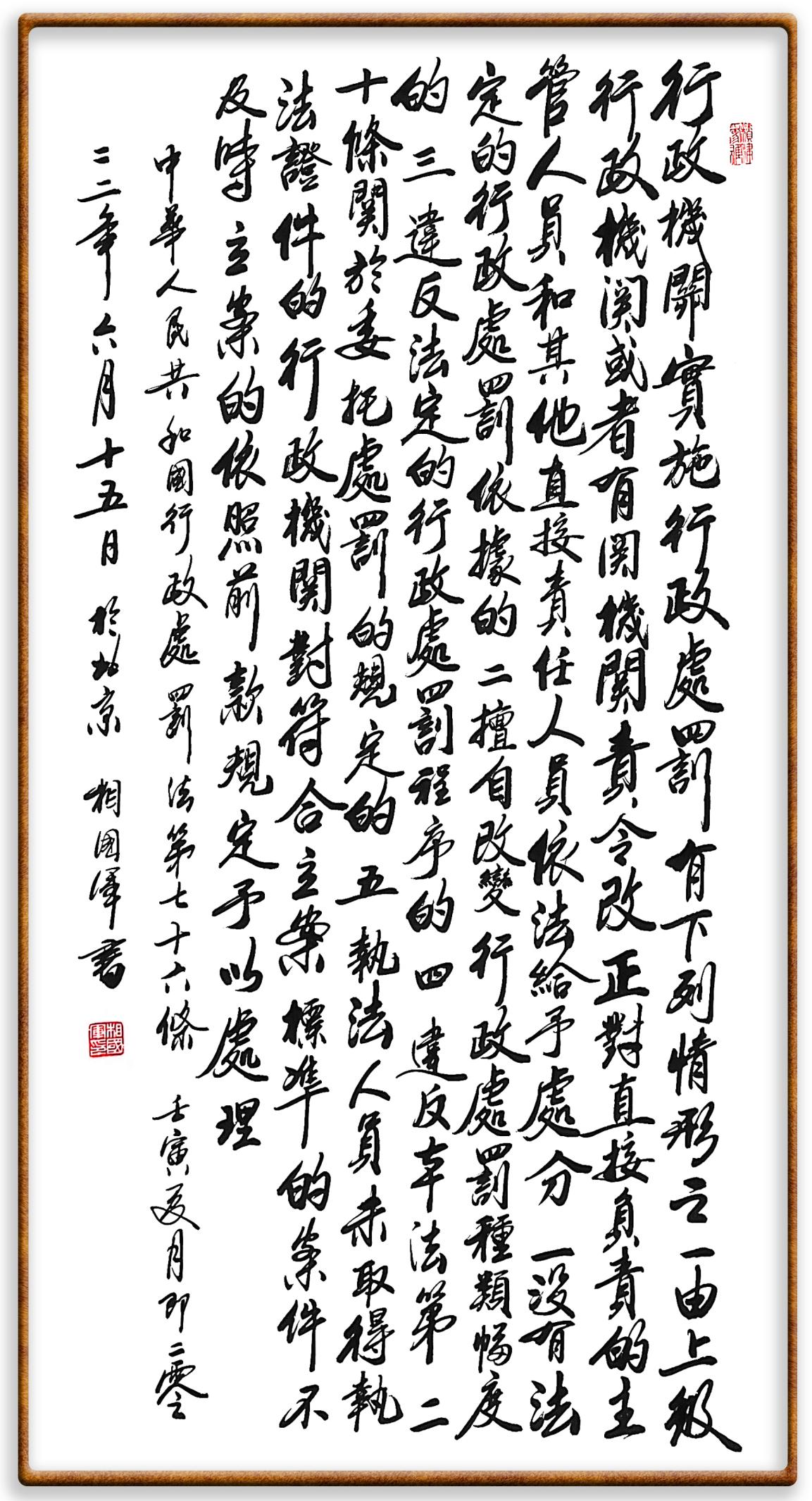 继《中华人民共和国民法典》《中华人民共和国土地管理法》《中华人民共和国土地管理法实施条例》《中华人民共和国法律援助法》之后,法治日报社联合北京市司法局、北京书法家协会,将笔端对准《中华人民共和国宪法》和《中华人民共和国行政处罚法》。