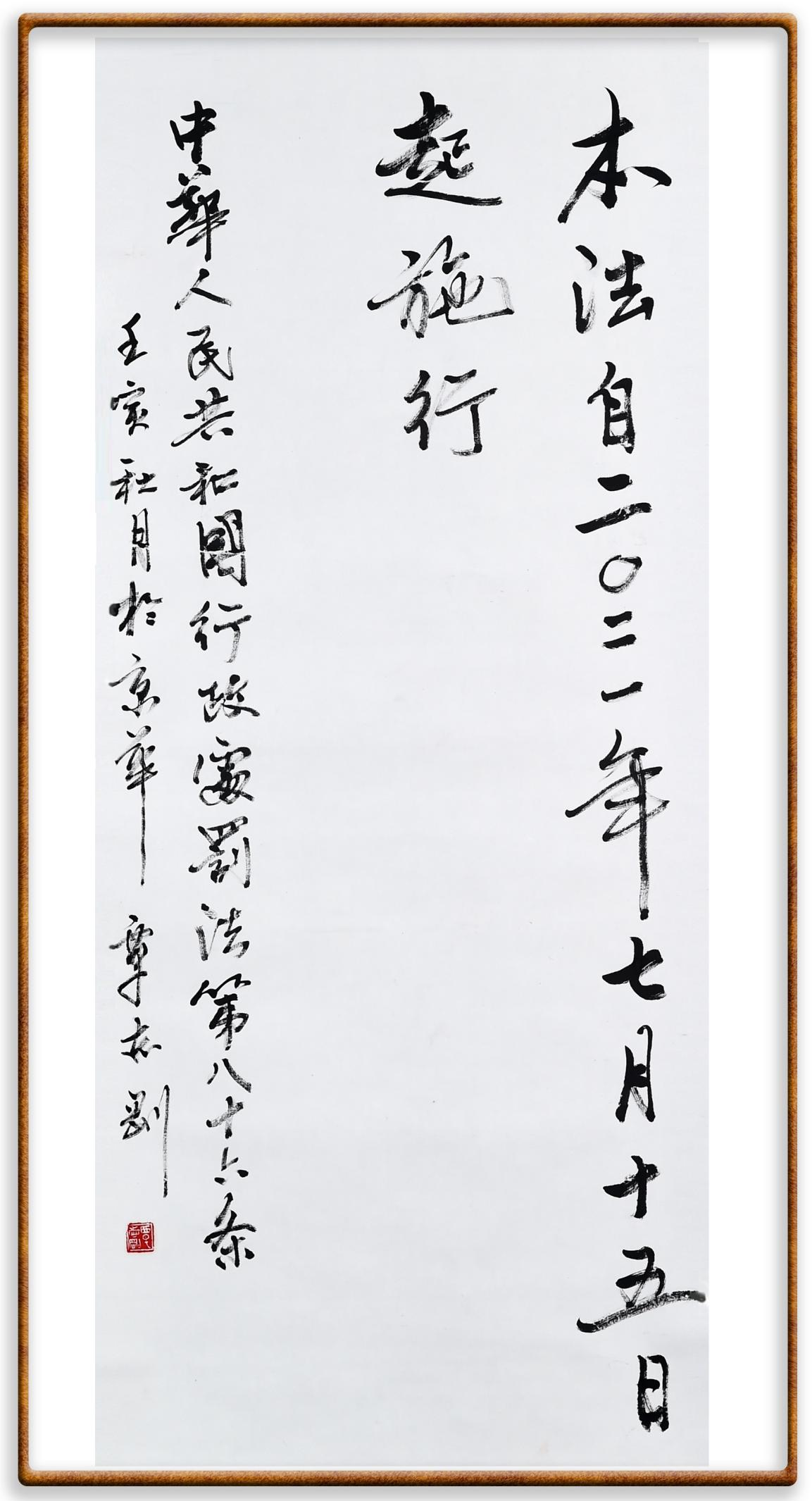 继《中华人民共和国民法典》《中华人民共和国土地管理法》《中华人民共和国土地管理法实施条例》《中华人民共和国法律援助法》之后,法治日报社联合北京市司法局、北京书法家协会,将笔端对准《中华人民共和国宪法》和《中华人民共和国行政处罚法》。