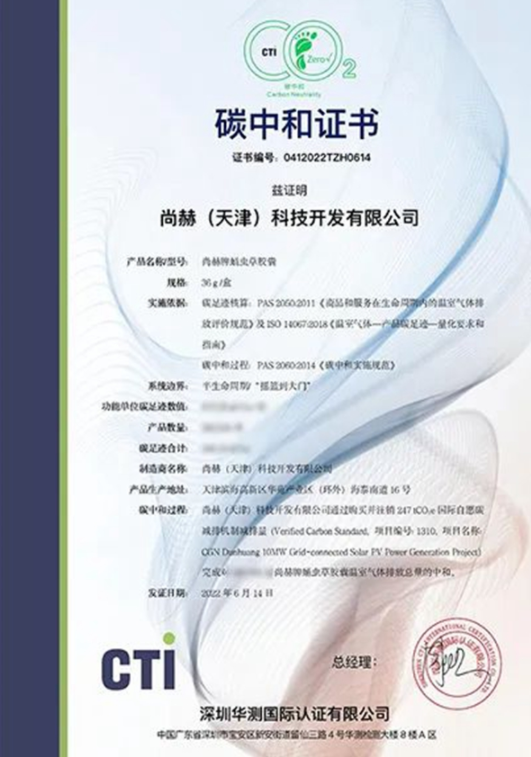 2022年6月,尚赫牌蛹虫草胶囊获得“碳中和”认证证书,该认证由中国合格评定国家认可委员会(CNAS)认可的第三方认证机构,按照国际通用标准,对尚赫牌蛹虫草胶囊的产品碳足迹(半生命周期)进行评价分析,尚赫牌蛹虫草胶囊也成为营养健康行业内首个获得“碳中和”认证的保健食品。
