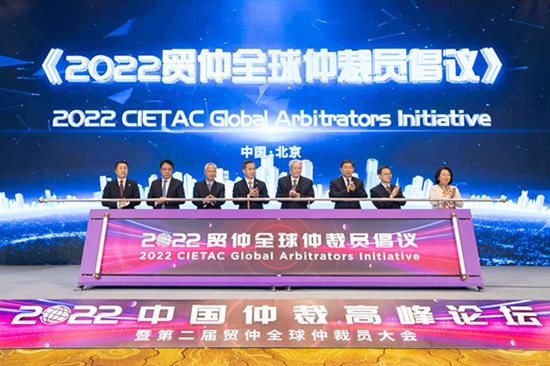 (任鸿斌会长、王胜明副主任、熊选国副部长、刘贵祥专委、柯良栋副会长、费宗祎荣誉仲裁员、郑若骅仲裁员、王承杰秘书长共同支持发布《2022贸仲全球仲裁员倡议》)