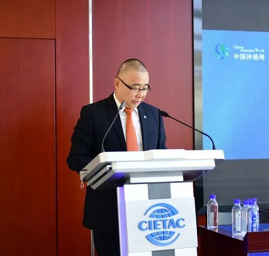 司法部公共法律服务管理局二级巡视员石海先生致辞,他指出,党和国家高度重视仲裁发展、强调要完善仲裁制度、提高仲裁的公信力,注重培养一批国际一流的仲裁机构,促进改革开放、保障社会经济的持续健康发展。中国政府积极支持仲裁机构走出去、请进来,加强国际交流合作、共建协作机制。这些创新和实践既充分体现了仲裁制度在服务全面对外开放,参与全球经贸、营商环境治理中的重要作用,也为进一步扩大仲裁交流合作创造了条件。当今世界正面临百年未有之大变局,贸易和投资争端不断加剧,仲裁作为国际通行的重要纠纷解决制度,是营商环境实现普惠共赢的方式。他强调,为推动金砖国家争议解决领域的交流合作,促进仲裁事业的进一步发展,一是要加强互鉴共建,打造全球服务仲裁品牌,二是要创新培养机制,聚力高端人才培养,三是深化国际交流,拓展广度深度,充分发挥金砖国家合作机制;随着中国全面依法治国,多方位全面开放深入推进,涉外法律服务在促进经济高质量发展,促进国际经贸合作的作用越来越重要,希望本届论坛进一步凝聚共识,发展合作,共享服务贸易发展新机遇,以扎实进取的金砖合作为国际经济注入持续稳定的力量。