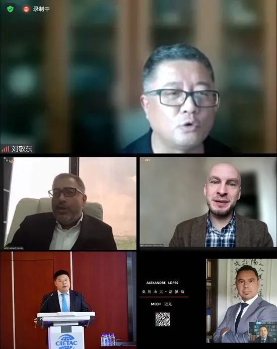 (从左至右、从上至下依次为主持人中国WTO法学会副会长,中国社会科学院国际经济法室主任刘敬东教授,发言嘉宾印度Trinaya律师事务所合伙人、印度律师协会主席Prashant Kumar先生、俄罗斯莫斯科国立大学法学院的 Alexander E.Molotnikov副教授、德和衡律师事务所主任、威海国际仲裁院院长刘克江博士、巴西麦克中国市场研究中心主席Alexandre Lopes先生)