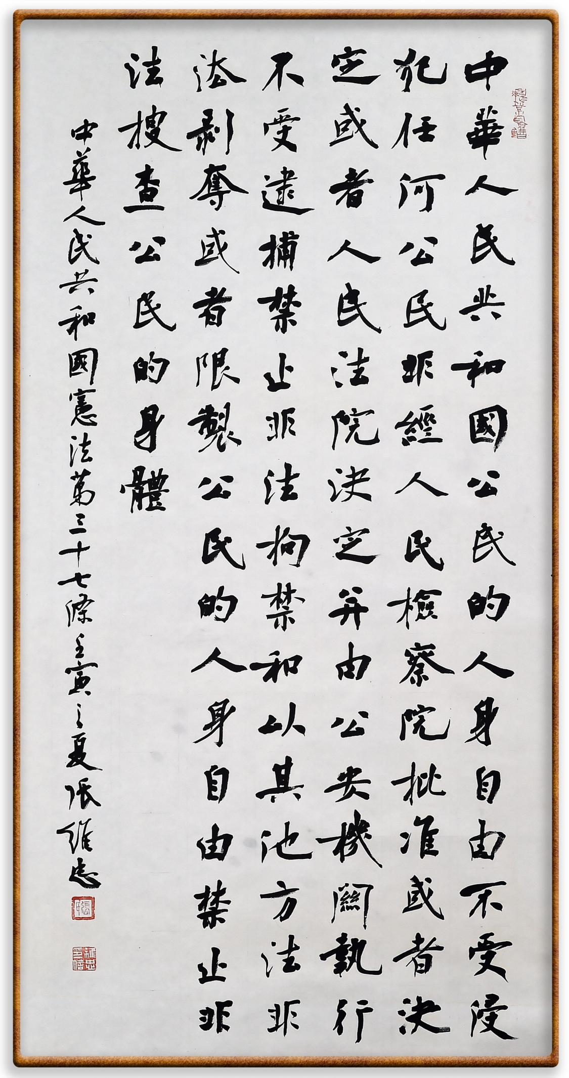 继《中华人民共和国民法典》《中华人民共和国土地管理法》《中华人民共和国土地管理法实施条例》《中华人民共和国法律援助法》之后,法治日报社联合北京市司法局、北京书法家协会,将笔端对准《中华人民共和国宪法》和《中华人民共和国行政处罚法》。